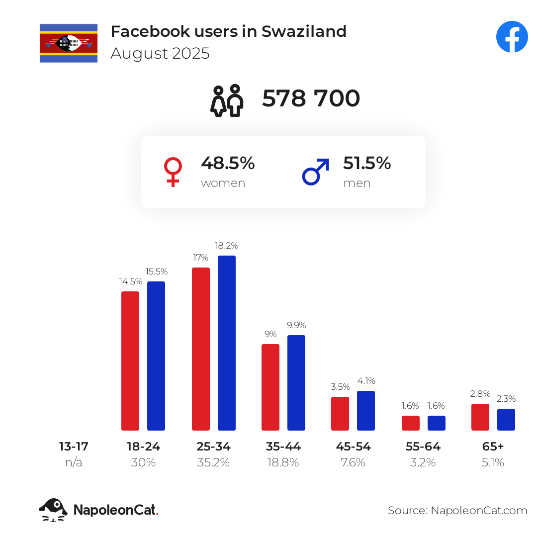 There were 578 700 Facebook users in Swaziland in August 2025, which accounted for 38.4% of its entire population.