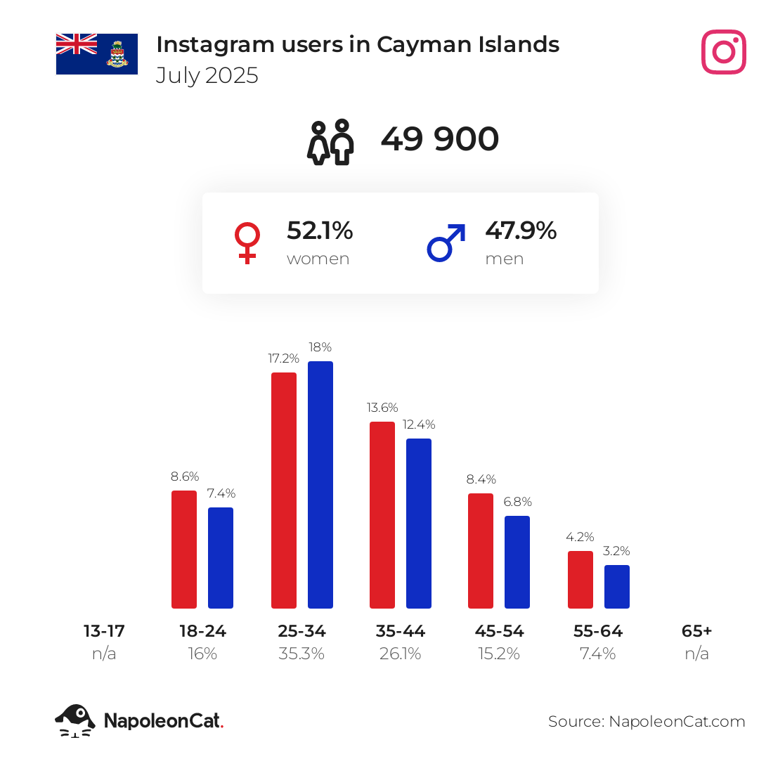 There were 49 900 Instagram users in Cayman Islands in July 2025, which accounted for 69.3% of its entire population.