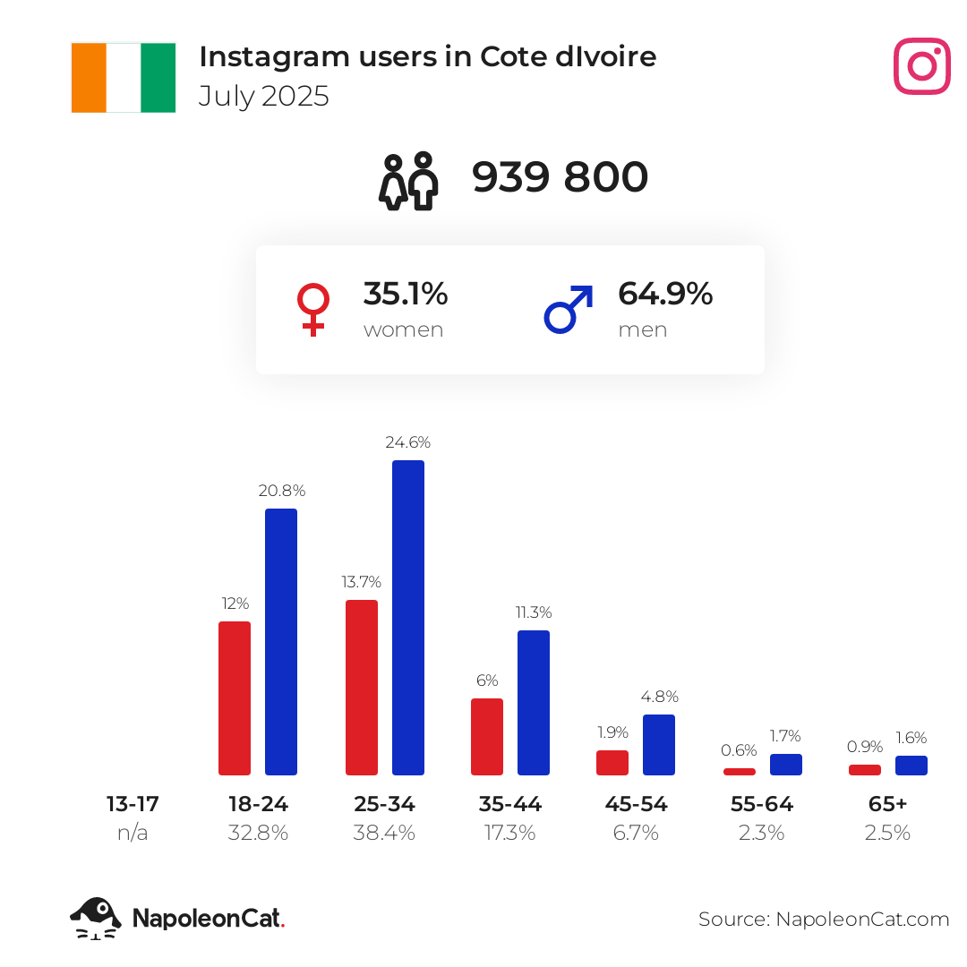 There were 957 100 Instagram users in Cote dIvoire in July 2025, which accounted for 3.2% of its entire population.