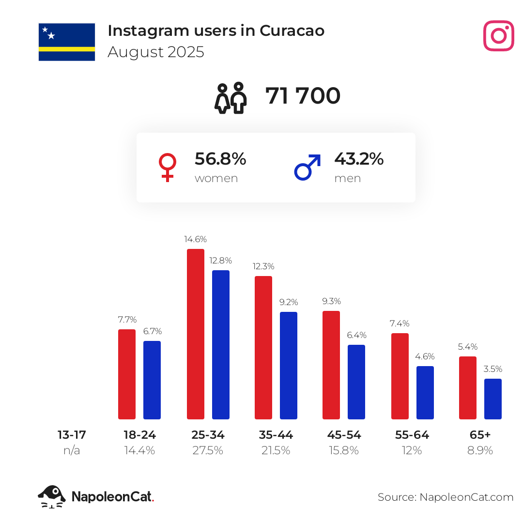 There were 71 700 Instagram users in Curacao in August 2025, which accounted for 42.7% of its entire population.