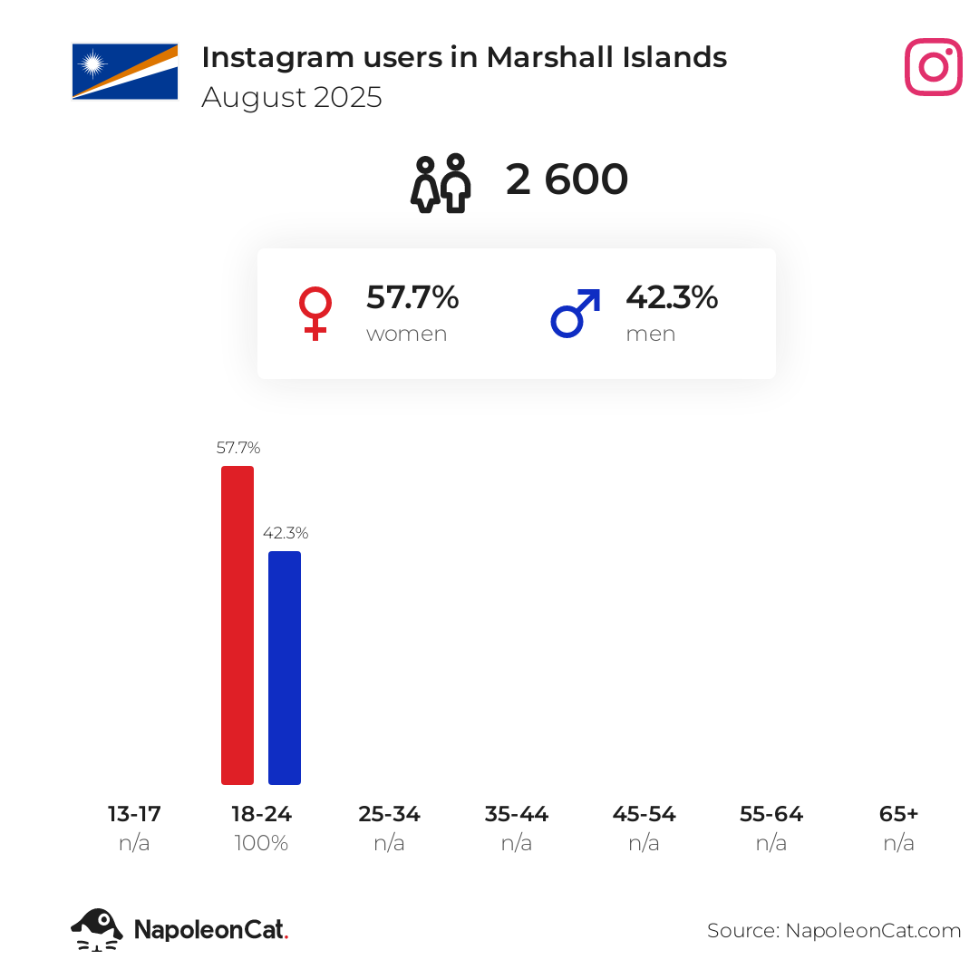 There were 2 600 Instagram users in Marshall Islands in August 2025, which accounted for 4.5% of its entire population.