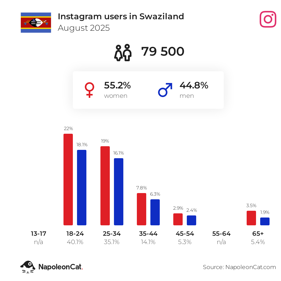 There were 79 500 Instagram users in Swaziland in August 2025, which accounted for 5.3% of its entire population.