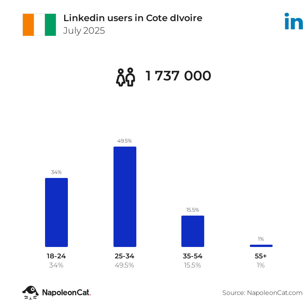 There were 1 697 000 Linkedin users in Cote dIvoire in July 2025, which accounted for 5.7% of its entire population.