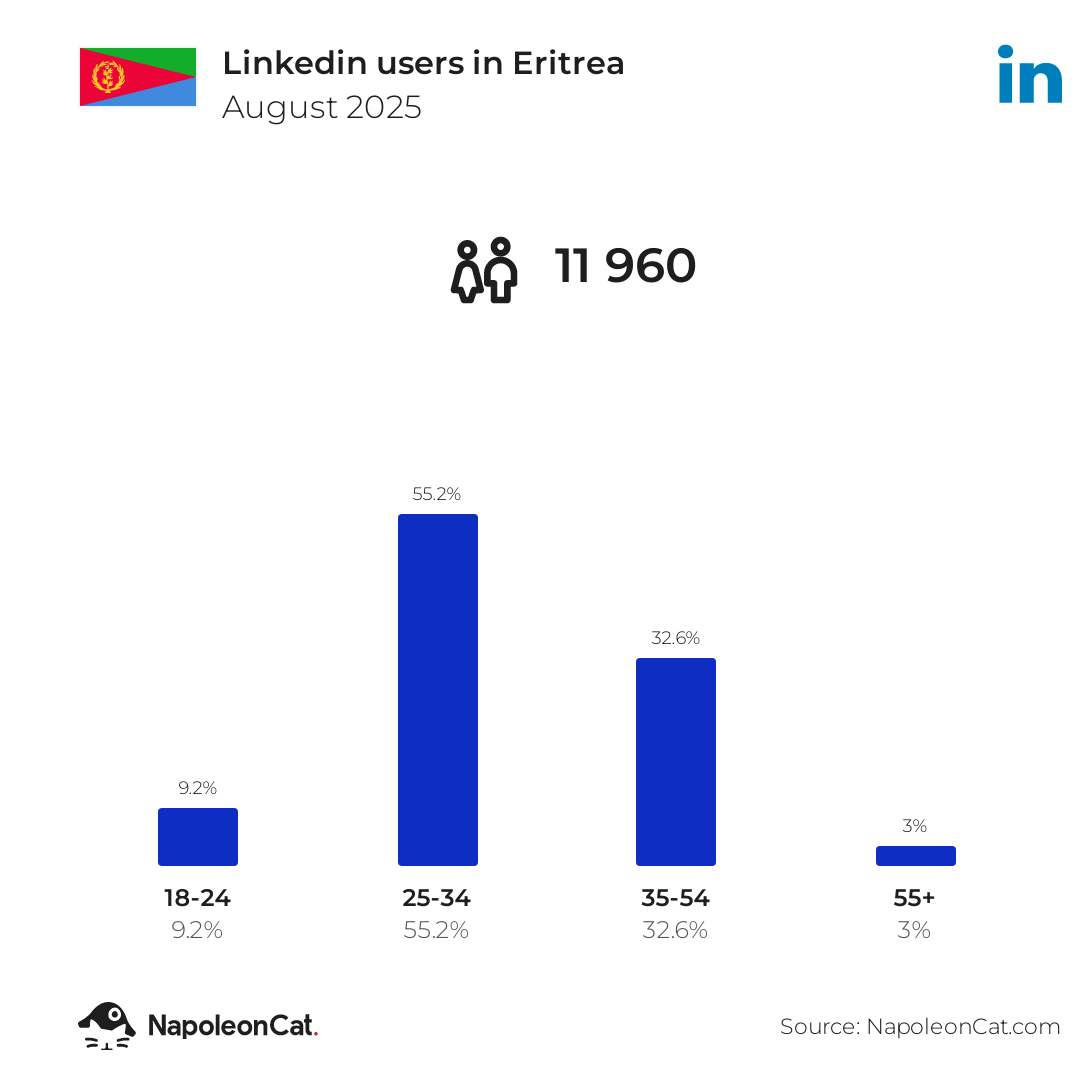 There were 11 960 Linkedin users in Eritrea in August 2025, which accounted for 0.2% of its entire population.