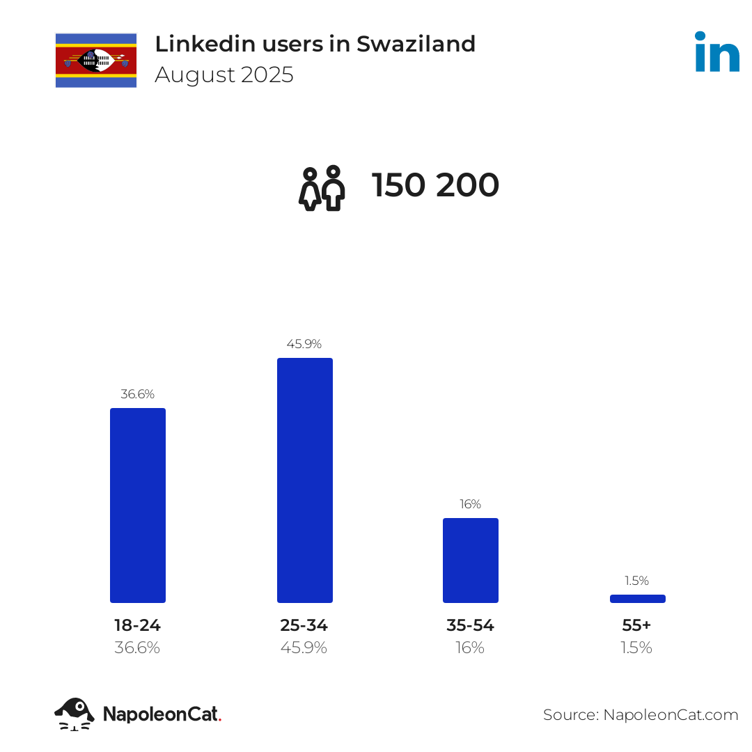 There were 150 200 Linkedin users in Swaziland in August 2025, which accounted for 10% of its entire population.