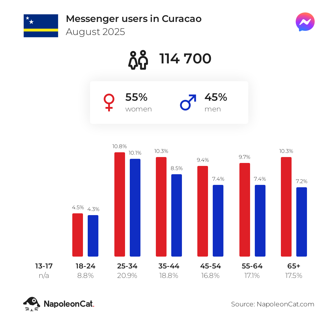 There were 114 700 Messenger users in Curacao in August 2025, which accounted for 68.3% of its entire population.