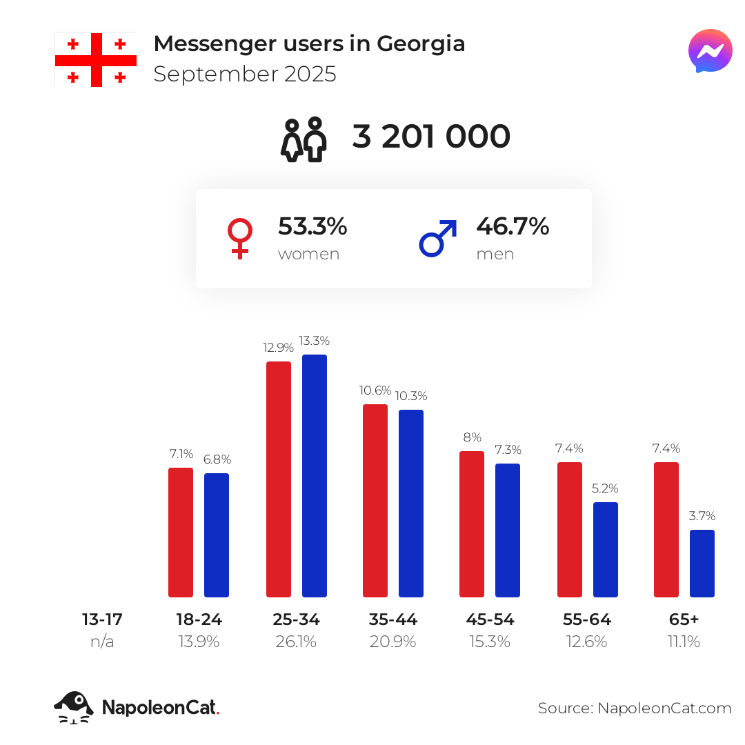 There were 3 201 000 Messenger users in Georgia in September 2025, which accounted for 82.1% of its entire population.