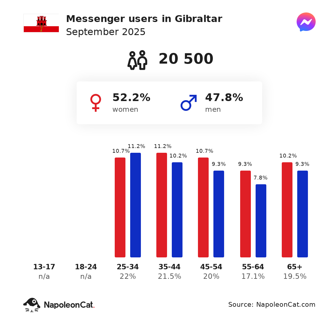 There were 20 500 Messenger users in Gibraltar in September 2025, which accounted for 56.9% of its entire population.