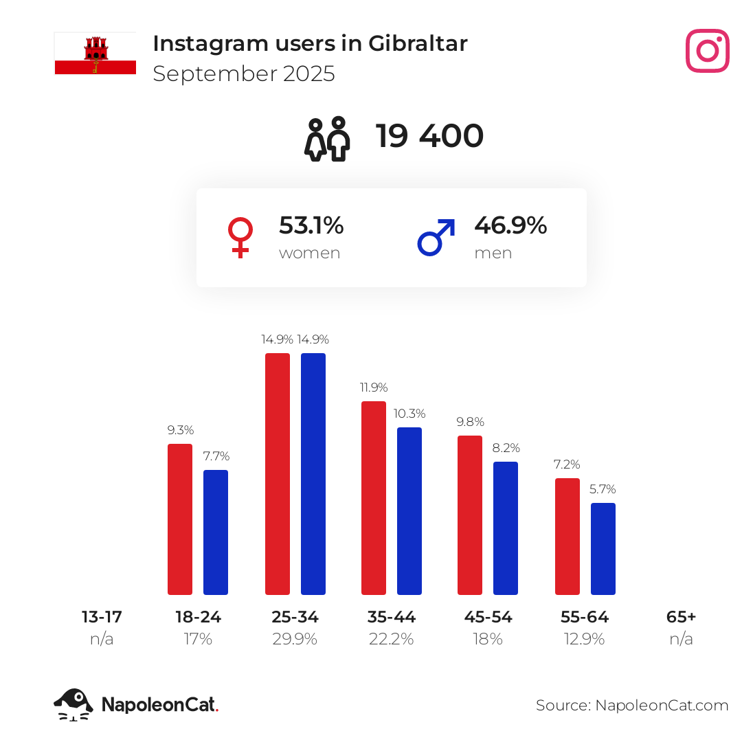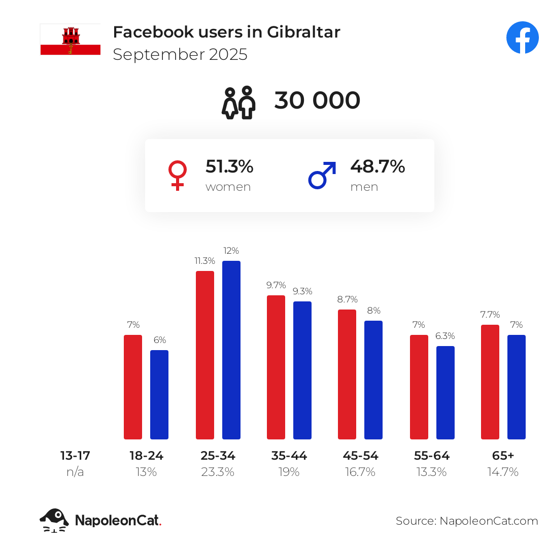 There were 30 000 Facebook users in Gibraltar in September 2025, which accounted for 83.3% of its entire population.
