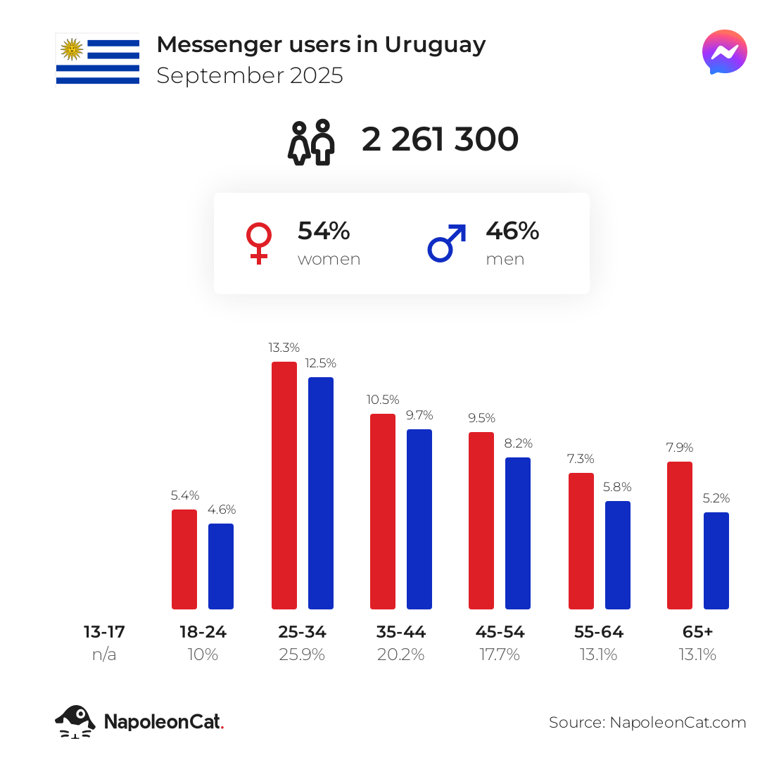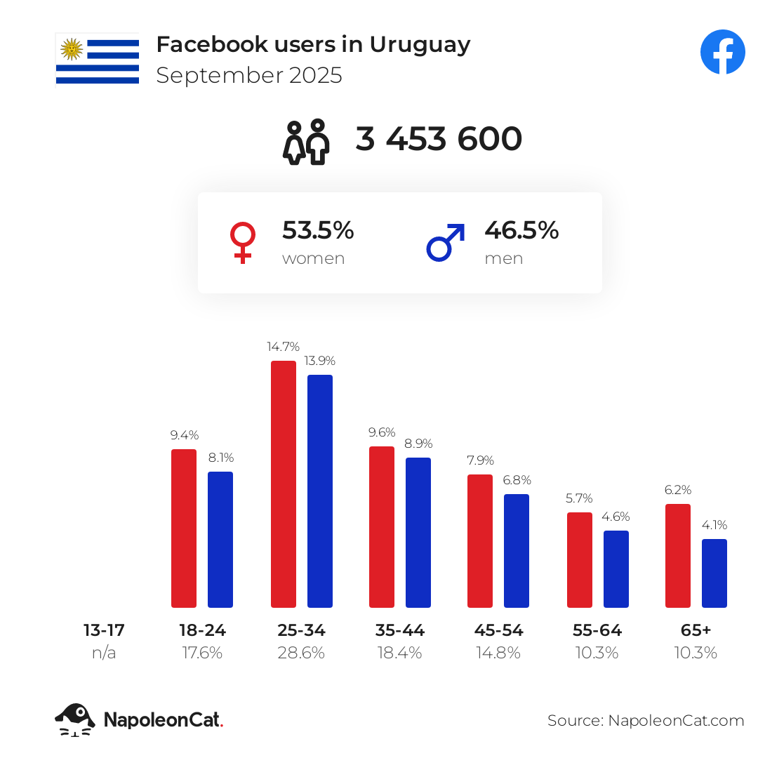 There were 3 453 600 Facebook users in Uruguay in September 2025, which accounted for 97.3% of its entire population.
